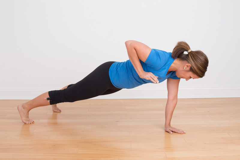 Plank Row – holding a push up plank position, “row” each elbow back to your waist while keeping your hips square to the floor.